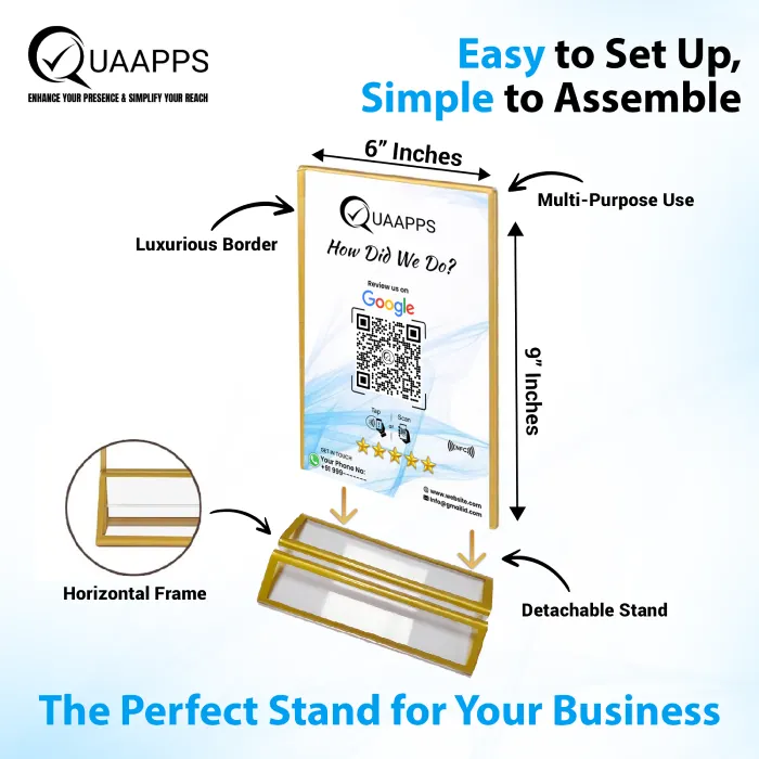 Improve your business visibility with the Quaapps Google Review and 2 Social Media Scanner — a compact, less space consuming dual-sided display designed to increase customer engagement instantly. Customers can simply tap via NFC or scan the advanced coloured QR code to access your Google Review page or social media profiles within seconds. The process is smooth, fast, and completely hassle-free.